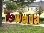 Das Bild zeigt den Eiszeitstein im Burggarten der Osterburg in Weida. An dem Stein ist eine Tafel angebracht, die die ungefähre Südgrenze der skandinavischen Inlandvereisung im Quartär zeigt.