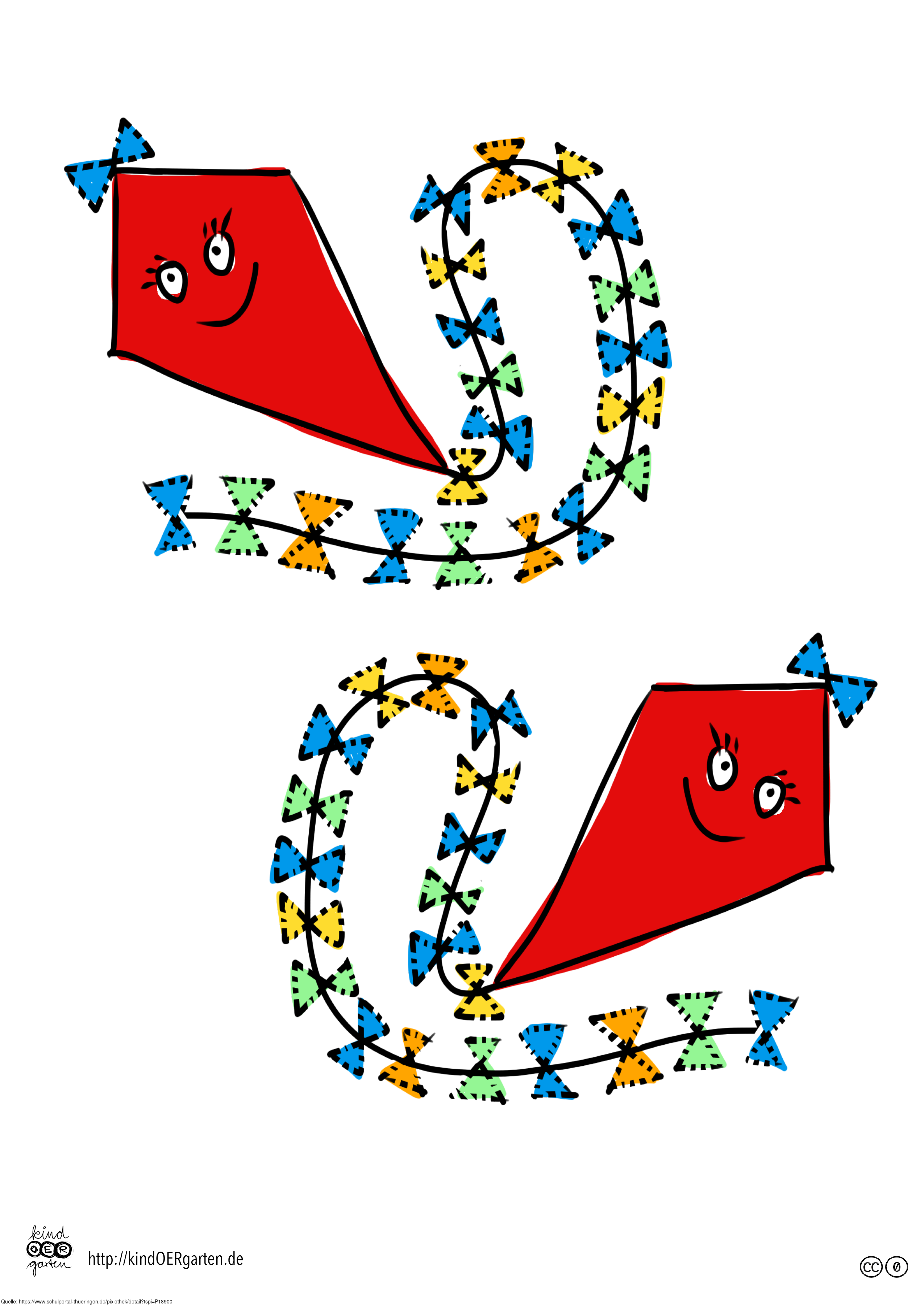 Das Bild zeigt zwei Drachen aus Papier (farbig) und kann als Schwungübung für Kinder im Kindergarten bzw. Elementarbereich dienen. Das Bild ist unter CC0 lizenziert und kann somit frei verwendet werden. Es ist neben weiteren Bildern auch hier zu finden: https://kindoergarten.wordpress.com/
