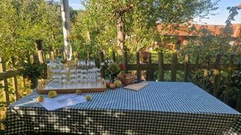 Das Bild zeigt eine Ansicht auf dem ApfelGut Erfurt. Auf einem Tisch mit einer blau-weiß karierten Tischdecke stehen Gläser, Karaffen und Äpfel bereit. Im Hintergrund befindet sich ein Holzzaun, der das Areal begrenzt. Es gelten die Nutzungsbedingungen der Mediothek und Pixiothek.