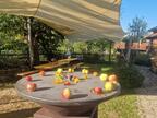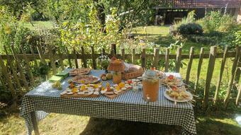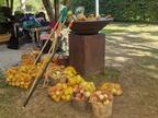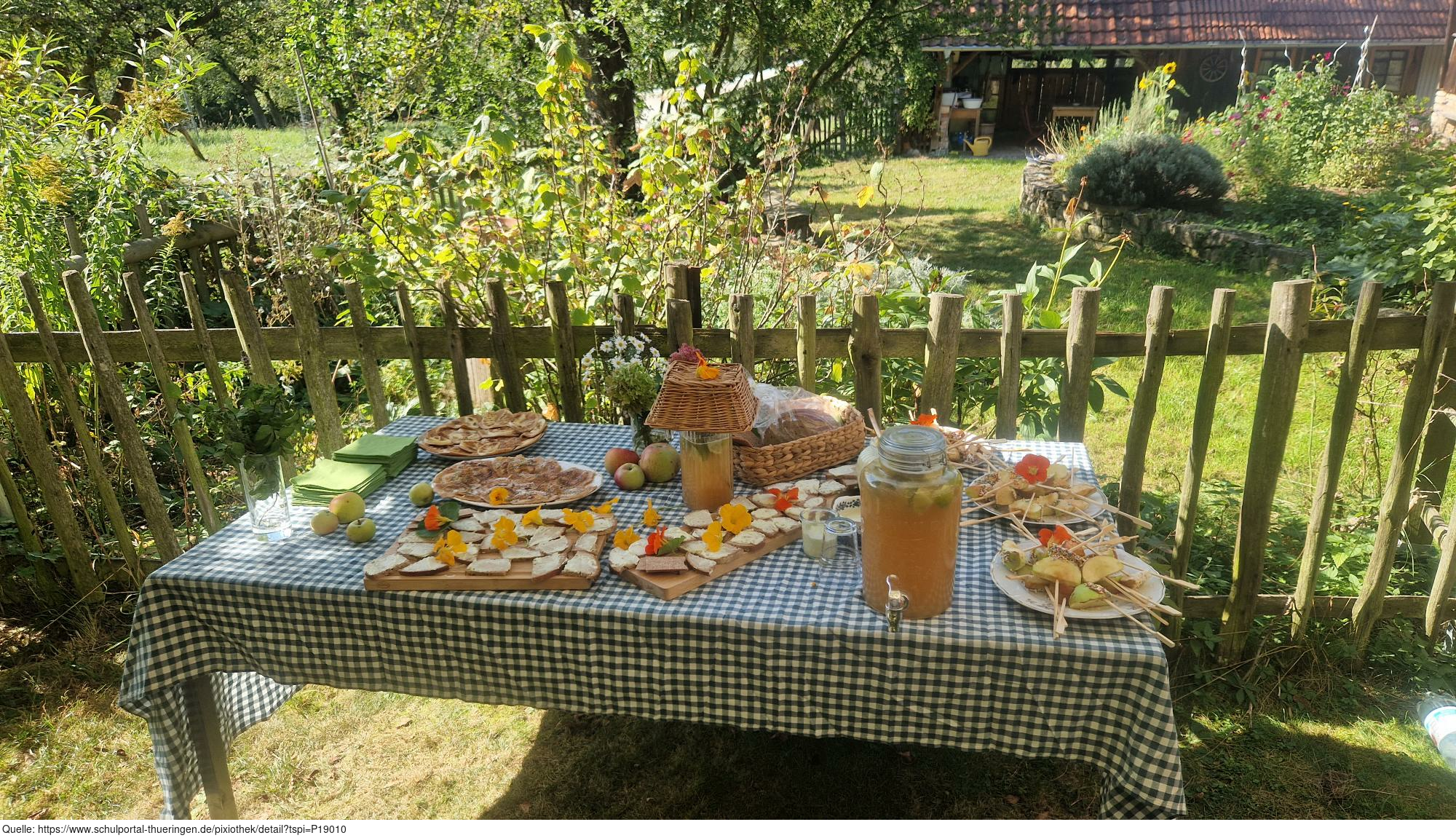 Das Bild zeigt eine Ansicht auf dem ApfelGut Erfurt. Auf einem Tisch im Freien befindet sich ein zum Thema Apfel bzw. Streuobstwiese passend angerichtetes Buffet. Es gelten die Nutzungsbedingungen der Mediothek und Pixiothek.