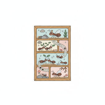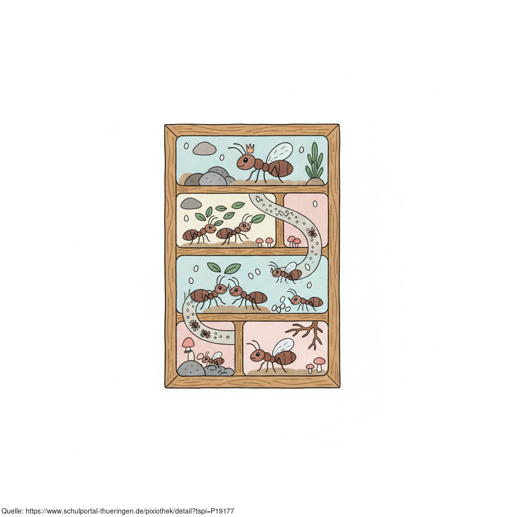 Das Bild zeigt eine gezeichnete Armeisenfarm. Das Bild wurde mittels einer KI (Gemini) erstellt und ist unter CC0 lizenziert. Weitere Bilder aus Herrn Emrich-Försters Bild-Archiv findet man hier: https://pix.foerster.rocks/