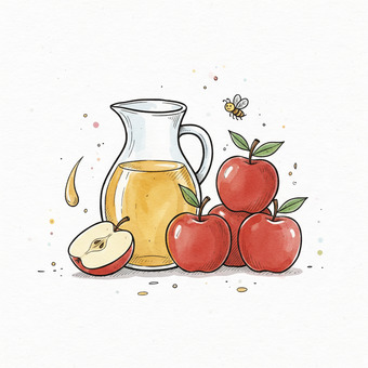 Das Bild zeigt gezeichnete Motive zum Begriff Apfelsaft. Das Bild wurde mittels einer KI (Gemini) erstellt und ist unter CC0 lizenziert. Weitere Bilder aus Herrn Emrich-Försters Bild-Archiv findet man hier: https://pix.foerster.rocks/