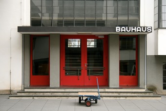 Abgebildet ist der Eingang des Bauhausgebäudes.