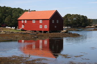 Abgebildet ist ein typisches Haus an einem Fjord.