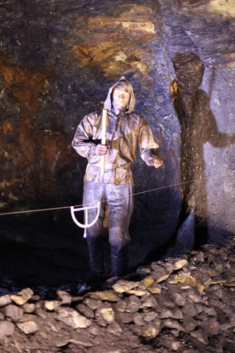 Abgebildet ist die Figur eines Markscheiders (im Bergwerk tätiger Vermessungsingenieur).