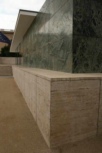 Das Foto gehört zur Serie "Deutscher Weltausstellungspavillon Barcelona 1929". Der deutsche Architekt Ludwig Mies van der Rohe entwarf diesen Ausstellungspavillon. Er gilt heute als Architekturikone des 20. Jahrhunderts. Das Bild zeigt eine Detailansicht vom Pavillon. Es gelten die Nutzungsbedingungen der Mediothek und Pixiothek.
