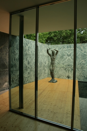 Das Foto gehört zur Serie "Deutscher Weltausstellungspavillon Barcelona 1929". Der deutsche Architekt Ludwig Mies van der Rohe entwarf diesen Pavillon. Er gilt heute als Architekturikone des 20. Jahrhunderts. Das Bild zeigt den Innenraum vom Pavillon mit der Skulptur "Der Morgen" des Künstlers Geog Kolbe. Es gelten die Nutzungsbedingungen der Mediothek und Pixiothek.