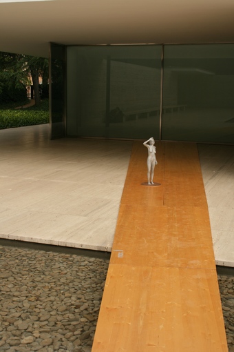 Das Foto gehört zur Serie "Deutscher Weltausstellungspavillon Barcelona 1929". Der deutsche Architekt Ludwig Mies van der Rohe entwarf diesen Pavillon. Er gilt heute als Architekturikone des 20. Jahrhunderts. Das Bild zeigt den Innenraum vom Pavillon mit der Skulptur "Der Morgen" des Künstlers Geog Kolbe. Es gelten die Nutzungsbedingungen der Mediothek und Pixiothek.