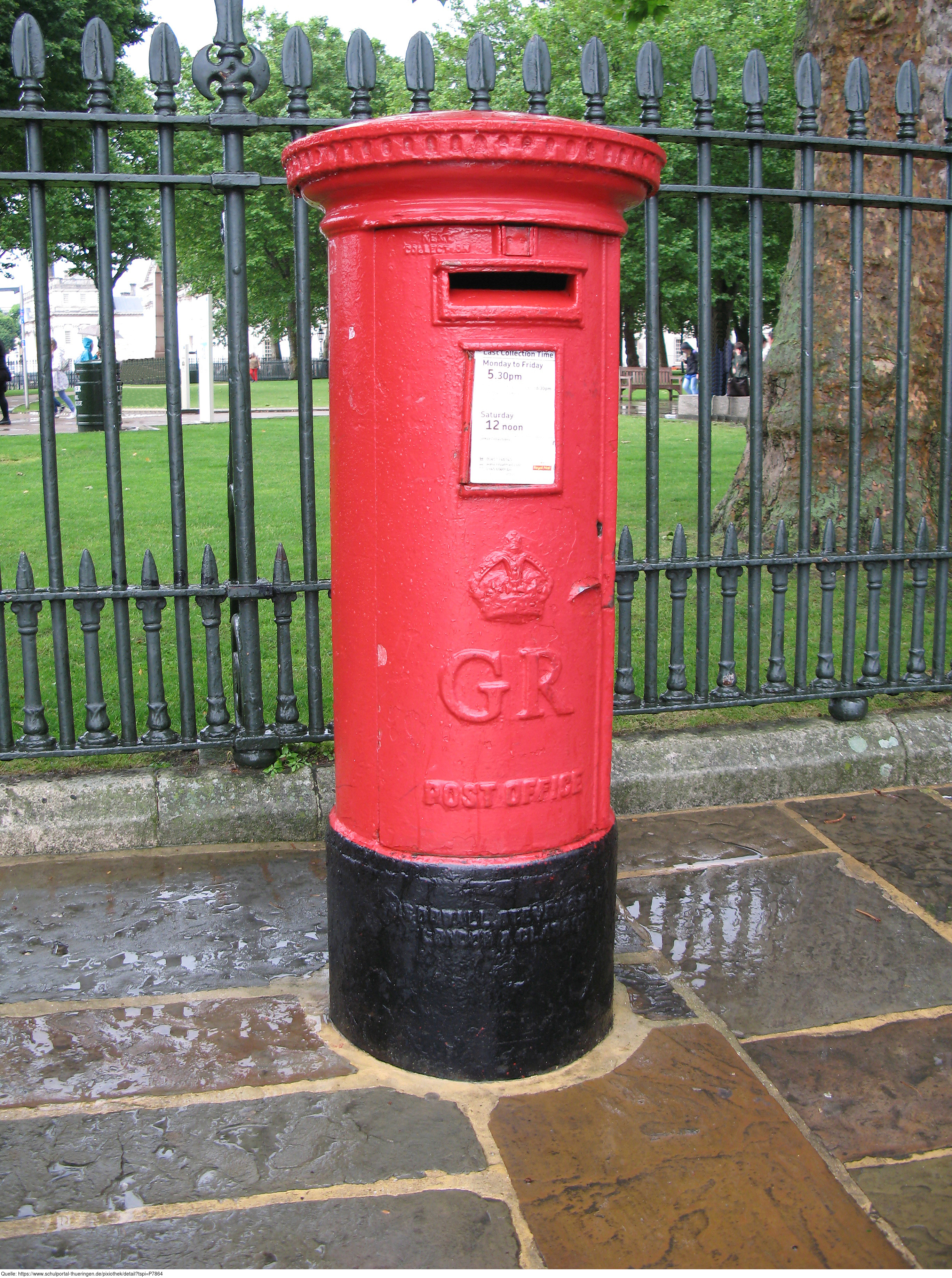 Das Foto gehört zur Serie London 2016. Es zeigt einen Briefkasten (mailbox, letter box, post box, pillar box). Es gelten die Nutzungsbedingungen der Mediothek und Pixiothek.