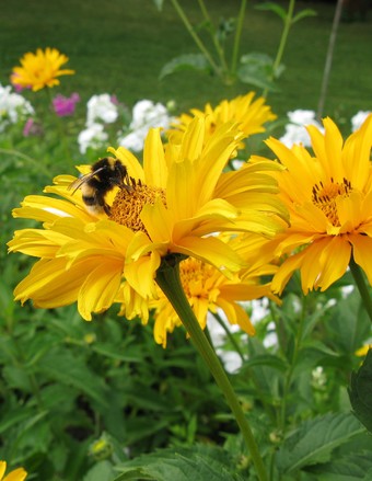 Das Foto gehört zur Serie Blumen im Garten. Es zeigt eine Ringelblume (Calendula). Sie ist einjährig und wächst am besten in Gruppen. Die Ringelblume ist nicht winterhart, wächst aber im Folgejahr durch ihren winterharten Samen von selbst wieder. Calendula officinalis war die Heilpflanze des Jahres 2009. Hier sucht eine Erdhummel nach Nektar. Es gelten die Nutzungsbedingungen der Mediothek und Pixiothek.
