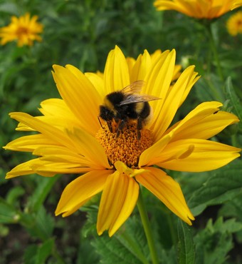 Das Foto gehört zur Serie Blumen im Garten. Es zeigt eine Ringelblume (Calendula). Sie ist einjährig und wächst am besten in Gruppen. Die Ringelblume ist nicht winterhart, wächst aber im Folgejahr durch ihren winterharten Samen von selbst wieder. Calendula officinalis war die Heilpflanze des Jahres 2009. Hier sucht eine Erdhummel nach Nektar. Es gelten die Nutzungsbedingungen der Mediothek und Pixiothek.