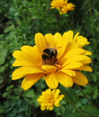 Das Foto gehört zur Serie Blumen im Garten. Es zeigt eine Ringelblume (Calendula). Sie ist einjährig und wächst am besten in Gruppen. Die Ringelblume ist nicht winterhart, wächst aber im Folgejahr durch ihren winterharten Samen von selbst wieder. Calendula officinalis war die Heilpflanze des Jahres 2009. Hier sucht eine Erdhummel nach Nektar. Es gelten die Nutzungsbedingungen der Mediothek und Pixiothek.