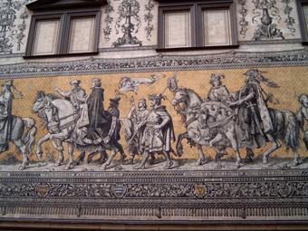 Das Foto gehört zur Serie "Dresdener Fürstenzug". Es zeigt den Abschnitt 1190 bis 1288 - Dietrich der Bedrängte, Heinrich der Erlauchte. Der Fürstenzug in Dresden ist das Bild eines Reiterzuges, aufgetragen auf rund 23.000 Fliesen aus Meißner Porzellan auf der Außenwand des Stallhofs in der Augustusstraße. Das 102 Meter lange Kunstwerk stellt die Ahnengalerie der zwischen 1127 und 1873 in Sachsen herrschenden Markgrafen, Herzöge, Kurfürsten und Könige aus dem Geschlecht des Fürstenhauses Wettin dar. Es gelten die Nutzungsbedingungen der Mediothek und Pixiothek.