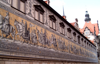 Das Foto gehört zur Serie "Dresdener Fürstenzug". Es zeigt die Gesamtansicht des Fürstenzuges. Der Fürstenzug in Dresden ist das Bild eines Reiterzuges, aufgetragen auf rund 23.000 Fliesen aus Meißner Porzellan auf der Außenwand des Stallhofs in der Augustusstraße. Das 102 Meter lange Kunstwerk stellt die Ahnengalerie der zwischen 1127 und 1873 in Sachsen herrschenden Markgrafen, Herzöge, Kurfürsten und Könige aus dem Geschlecht des Fürstenhauses Wettin dar. Es gelten die Nutzungsbedingungen der Mediothek und Pixiothek.