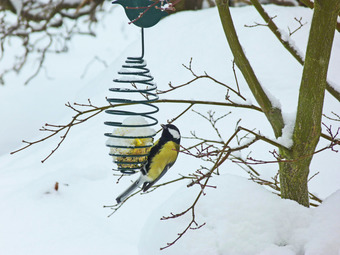 Das Foto gehört zur Serie "Vögel im Winter". Es zeigt eine Kohlmeise an der Futterspirale. Es gelten die Nutzungsbedingungen der Mediothek und Pixiothek.