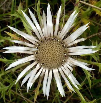 Das Foto gehört zur Serie "Blüten auf einem Thüringer Zechsteinriff". Es zeigt die Blüte einer Silberdistel (Carlina acaulis). Es gelten die Nutzungsbedingungen der Mediothek und Pixiothek.