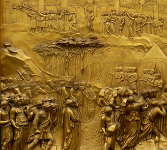 Das Foto gehört zur Serie "Paradiestür am Baptisterium von Florenz". Es zeigt den Untergang von Jericho, ein Bronzerelief von Lorenzo Ghiberti. Es ist rechts in der vierten Reihe der zehn Bildtafeln in seine Paradiestür (auch Paradiespforte genannt) eingebunden. Es gelten die Nutzungsbedingungen der Mediothek und Pixiothek.