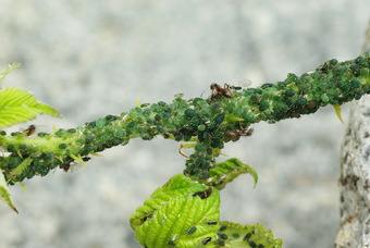 Das Foto gehört zur Serie "Schädlinge von Nutzpflanzen". Es zeigt einen Ast mit Blattläusen (Aphidoidea). Blattläuse ernähren sich von Pflanzensaft. Das Bild ist unter CC0 lizenziert und kann somit frei verwendet werden.