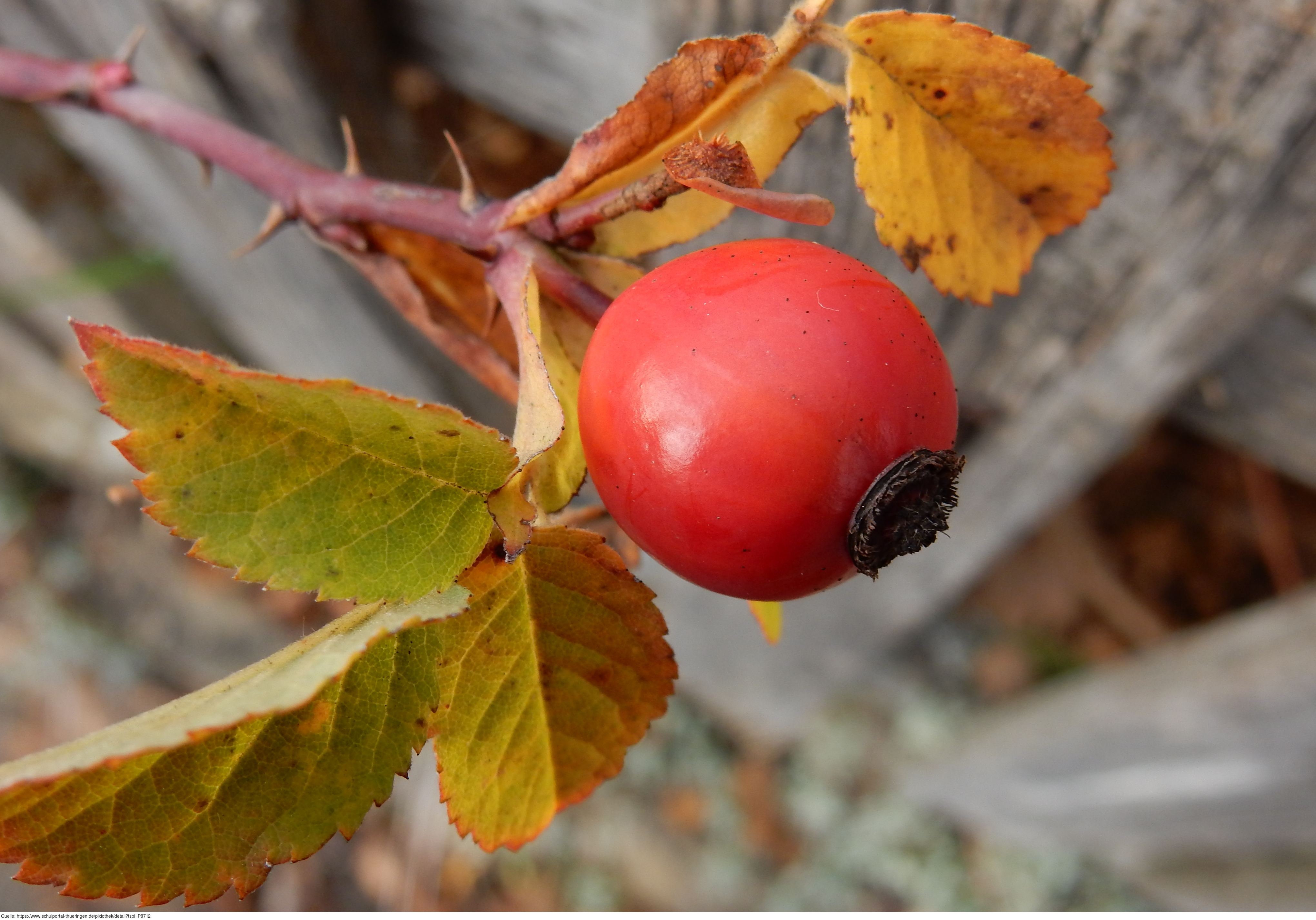 Das Foto gehört zur Serie "Pflanzen". Es zeigt eine Hagebutte. Die Hagebutte ist eine Sammelfrucht, die viele kleine Nüsse enthält. Das Bild ist unter CC0 lizenziert und kann somit frei verwendet werden.