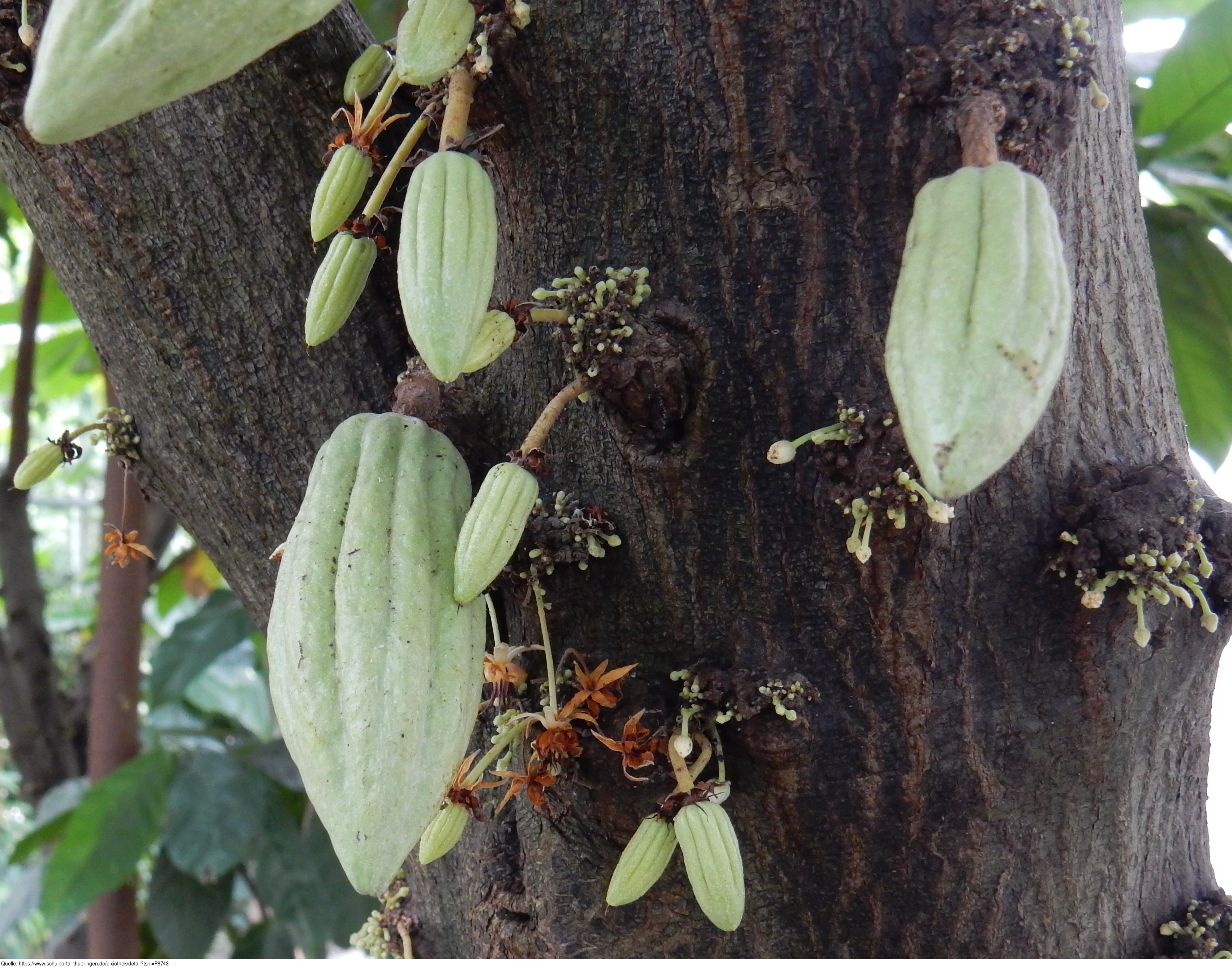 Das Foto gehört zur Serie "Kakao". Es zeigt geschlossene, geöffnete und verwelkte Blüten sowie sich entwickelnde Früchte am Stamm eines Kakaobaums. Das Bild ist unter CC0 lizenziert und kann somit frei verwendet werden.