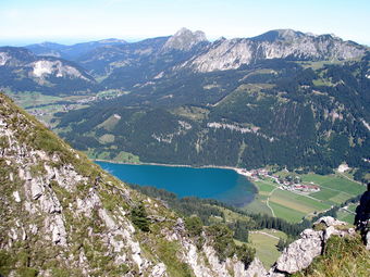 Das Bild gehört zur Serie "Alpen". Es zeigt den Blick vom Berg auf einen Teil vom Haldensee im Tannheimer Tal (österreichische Bundesland Tirol). Das Bild ist unter CC0 lizenziert und kann somit frei verwendet werden.
