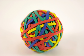 Das Foto gehört zur Serie "Strukturen und Oberflächen". Es zeigt einen Gummiball, hergestellt aus Gummiringen. Das Bild ist unter CC0 lizenziert und kann somit frei verwendet werden.