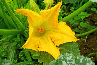 Das Bild gehört zur Serie "Blüten von Gemüsepflanzen". Es zeigt eine Blüte der Zucchini (Cucurbita pepo), die zur Pflanzenfamilie der Kürbisgewächse (Cucurbitaceae) gehört. Das Bild ist unter CC0 lizenziert und kann somit frei verwendet werden.