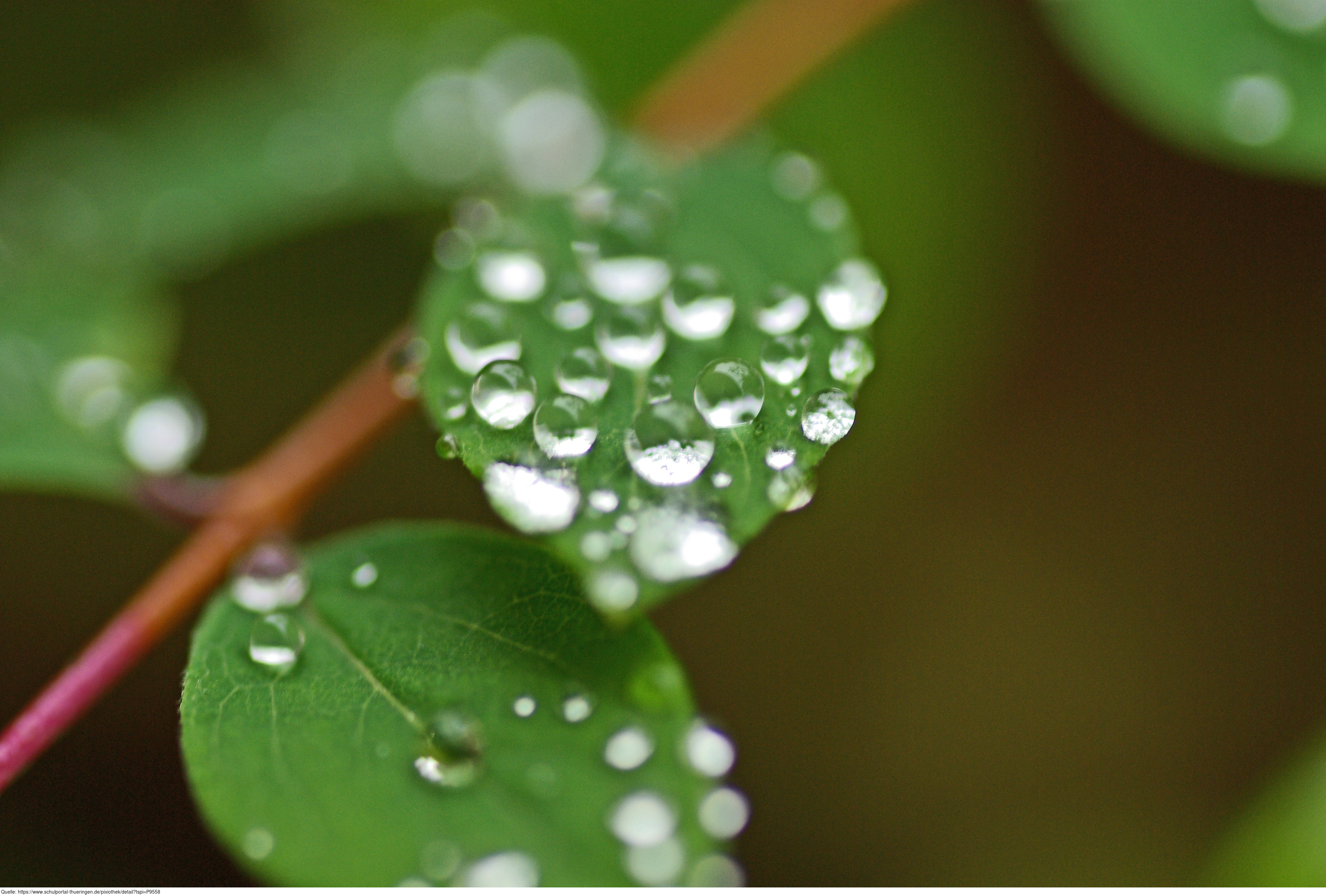 Das Bild gehört zur Serie "Wetter - Niederschlag". Es zeigt Tautropfen auf einer Pflanze. Das Bild ist unter CC0 lizenziert und kann somit frei verwendet werden.